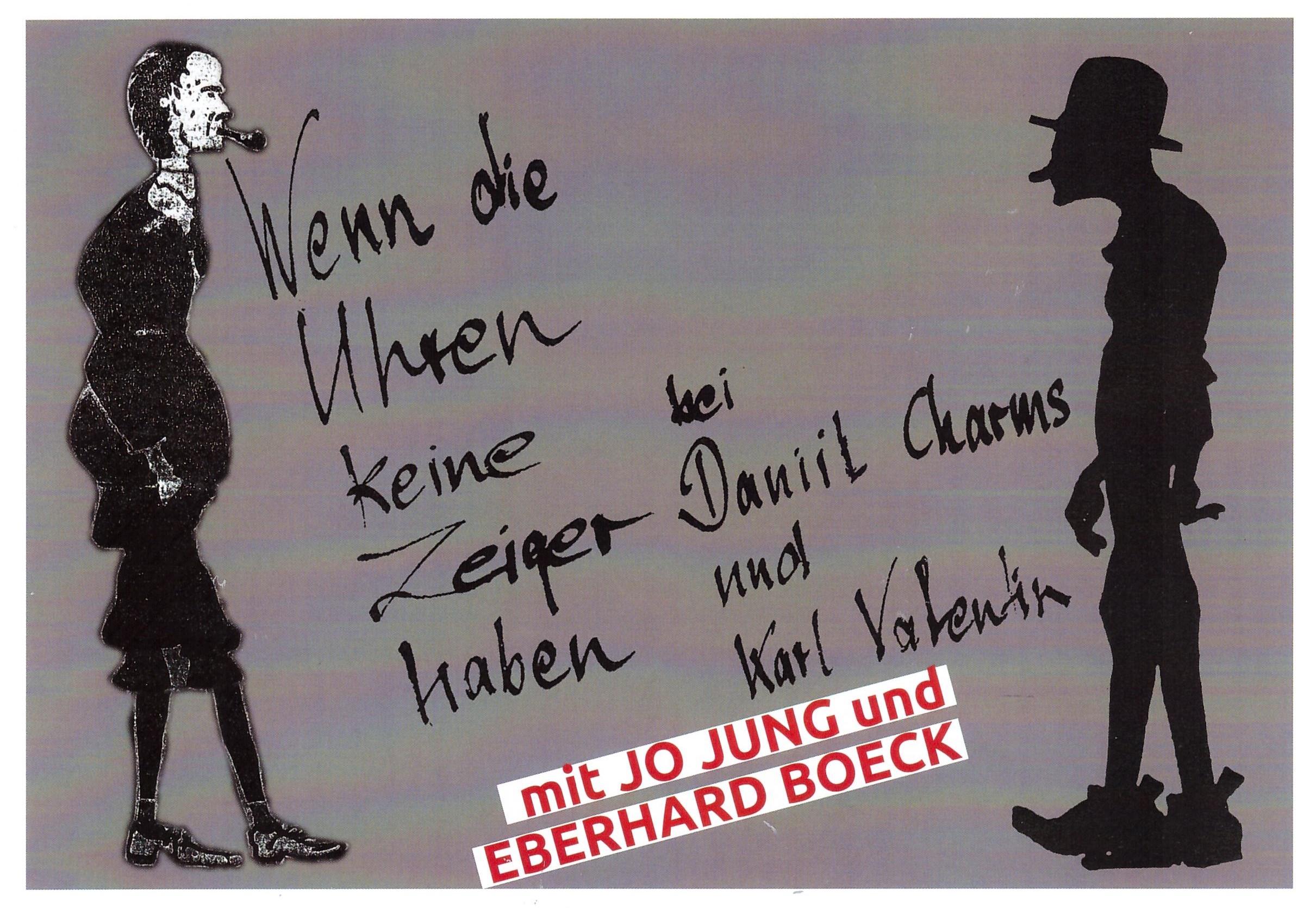 Ein vergnüglicher Abend mit Texten von Karl Valentin und Daniil Charms und den Schauspielern Eberhard Boeck am Stehpult und Jo Jung am Piano. Keine „akademische“ Veranstaltung, sondern ein vergnüglicher Vergleich der beiden Humoristen aus der ersten Hälfte des vorigen Jahrhunderts.